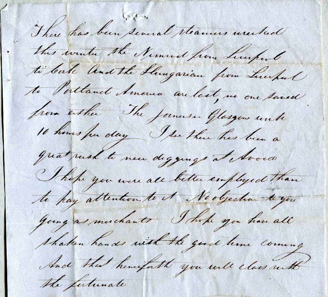 p.3) purse and one may say that “things in general” are mending considerably, but, indeed, to anyone acquainted with the workings of the British money market and the vicissitudes to which trade is liable through the merest straw out of its place, there will appear little surprising if we wether(?) along as we are doing for a year or two yet, in a kind of intermediate state between hunger and starvation, living and dying. It was thought that once Sir Colin got his army in working order in India we would have a renewal of confidence and a proportionate “burst” of work all over the country, but now that he is beginning “to do it” that confounded China business has to be begun in earnest. Well coming along a bit caution becomes ours, but